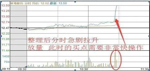 3、整理后突现急剧放量的动作,分时直线拉升,属于主力做多的体现,买入(做T低吸)信号。