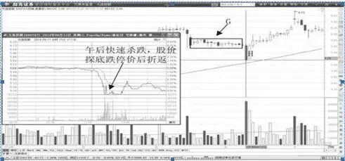 要点2:日K线图中显示,该股前期走势显然非常稳定,图中G位置的横向调整中价格波动空间有限。突然出现的大阴线形态,显然是该股异常波动的信号。这样看来,大阴线出现以后该股在图中H位置以大阳线反弹。那么我们在股价超跌期间建仓,自然获得很好的收益。