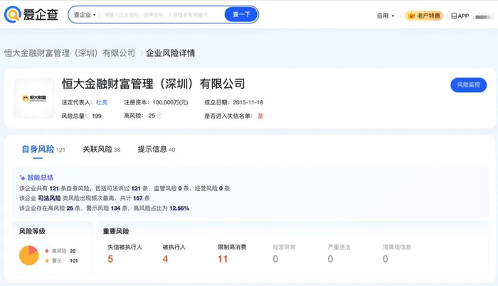风险信息显示,恒大金融财富管理(深圳)有限公司现存多条被执行人信息,被执行总金额9.56万元,此外该公司还存在多条失信被执行人(老赖)、限制高消费及终本案件信息。