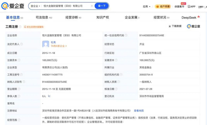 据悉,该微博账号的认证为恒大金融财富管理(深圳)有限公司。爱企查App显示,恒大金融财富管理(深圳)有限公司成立于2015年11月,法定代表人为杜亮,注册资本10亿元人民币,经营范围包括受托资产管理、股权投资、企业管理咨询。股东信息显示,该公司由恒大金融控股集团(深圳)有限公司全资持股。