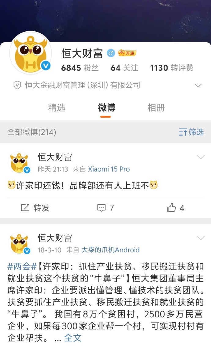 恒大财富官方账号喊话许家印还钱