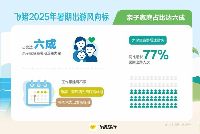数据显示,亲子家庭是暑期出游的主力军,占比达六成。这样的客群结构也决定了暑期游的预订及出行规律,即每周二至周四是预订高峰,每周六则是出发的“吉日”,俨然是“周中计划,周末出逃”,工作带娃两不误。这也意味着,对价格随供需情况实时变化的机票、酒店等旅游服务来说,无论是错峰预订还是错峰出行,在持续两个月的暑期旺季依然有不少“捡漏”机会。