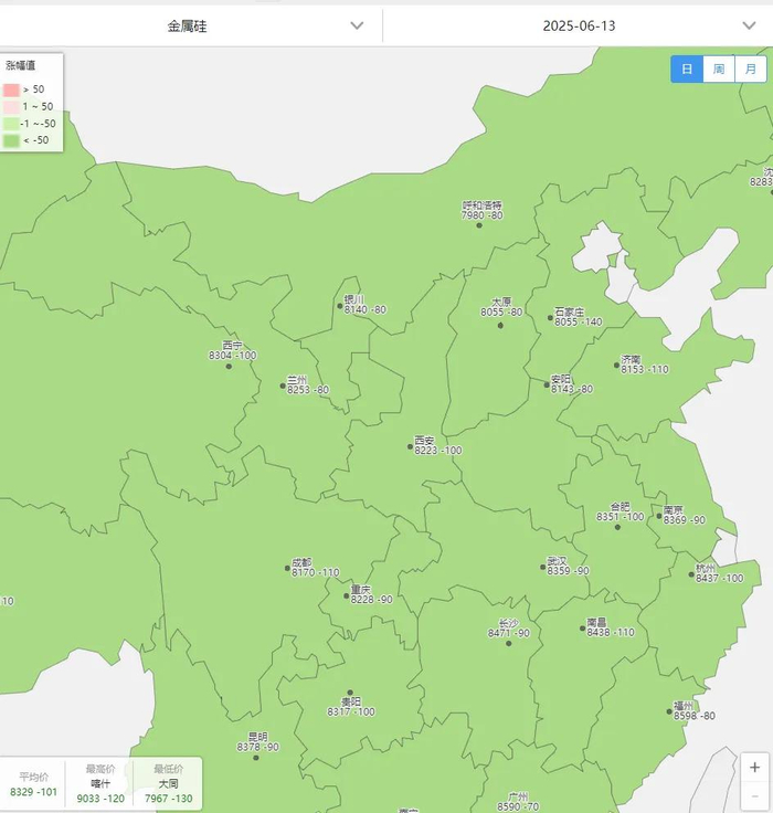 现货方面:大厂减停产消息传出缓解供应压力叠加其他消息刺激及久跌之后浓厚的盼涨情绪,近期工业硅期货行情表现较好,盘面价格一路上冲(截止昨日收盘,工业硅主力合约2509盘中最高价格为8280),业内悲观恐慌情绪得到明显改善,多数挺价意愿较强,市场低价货源减少。但供需失衡始终对整体行情形成压制,且今日部分地区工厂因进入丰水期电价下调有复产消息传出,同时,新疆大厂继减产传闻后再现复产预期(消息是否属实还有待验证)均使整体行情“雪上加霜”,今日期货行情再度进入下跌通道,盘面价格跌势明显,业内悲观恐慌情绪增加,现货行情偏弱运行市场报价随之松动。