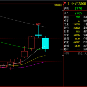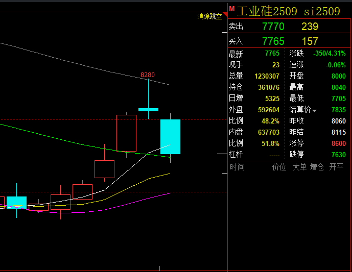 一番强势上攻后,今日工业硅期货行情松动下行,盘面价格跌幅明显!7月1日,截止15:00收盘,工业硅主力合约2509收盘飘绿运行,开盘8000,收盘下调350至7765,跌幅4.31%,收盘价格相较上一交易日下调295。另,主力合约当日成交总量为1230307手,持仓量361076手,当前总持仓量581147手,具体如下图所示: