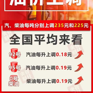 从7月1日24时起,国内汽、柴油每吨分别上调235元和225元,全国平均来看,92号汽油、95号汽油和0号柴油每升上调0.18元、0.19元和0.19元。央视财经记者给您算了一笔账,用92号汽油加满50升的油箱将多花9元。