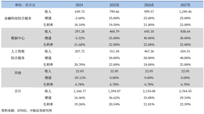 公司一直以来向金融机构、政府与公共事业、企业提供数据中心综合服务。公司数据中心综合服务包括信息系统集成、IT运维管理、数据中心建设、设备维保服务、数据治理、数据分析服务等。公司通过多年积累,资质及服务体系等较为全面。2024年公司数据中心综合服务营业收入2.97亿元,销售合同签订金额5.57亿元。生成式人工智能的兴起,对算力的需求明显增加。IDC与浪潮信息联合发布的《中国人工智能计算力发展评估报告》显示,2025年中国智能算力规模将达到1037.3EFLOPS,较2024年增长43%;中国人工智能算力市场规模将达到259亿美元,较2024年增长36.2%。我们预计该业务2025-2027年增速分别为55.00%、40.00%、30.00%。