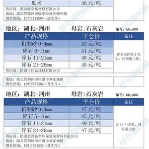 湖北宜昌机制砂、碎石下降2-3元/吨;黄石机制砂、碎石下降1-3元/吨;黄冈碎石下降1.5-2元/吨;荆州碎石下降10元/吨;