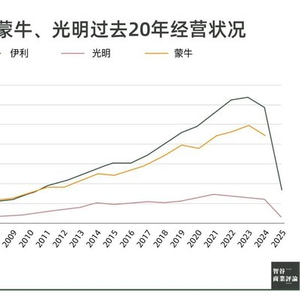 2002年光明上市,以50亿元营收位列行业第一,超过当时伊利与蒙牛的总和。2024年,伊利、蒙牛营收分别是光明的4.77倍和3.65倍,而光明的市值仅为伊利的6.5%;