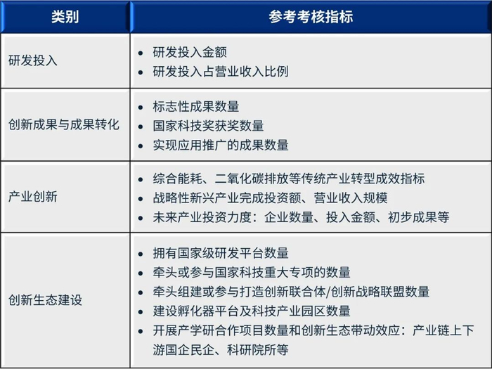 在创新目标设定上,建议国资央企围绕三大方向,就形成标志性成果和创新应用推广等工作进行考核。参考“署名文章”,可选择的考核指标汇总如下。