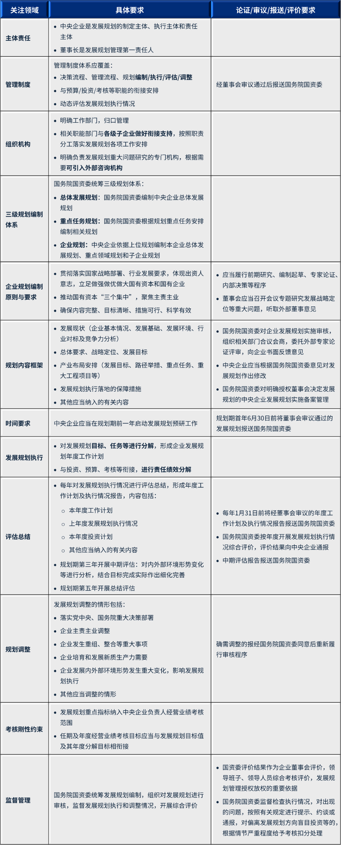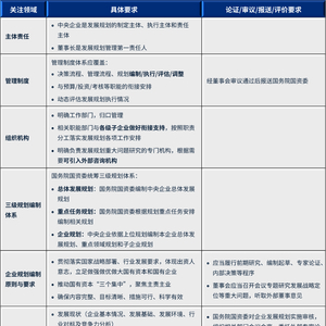 总结《规划管理办法》对于央企规划工作机制建设的具体要求,主要体现在以下几个方面。