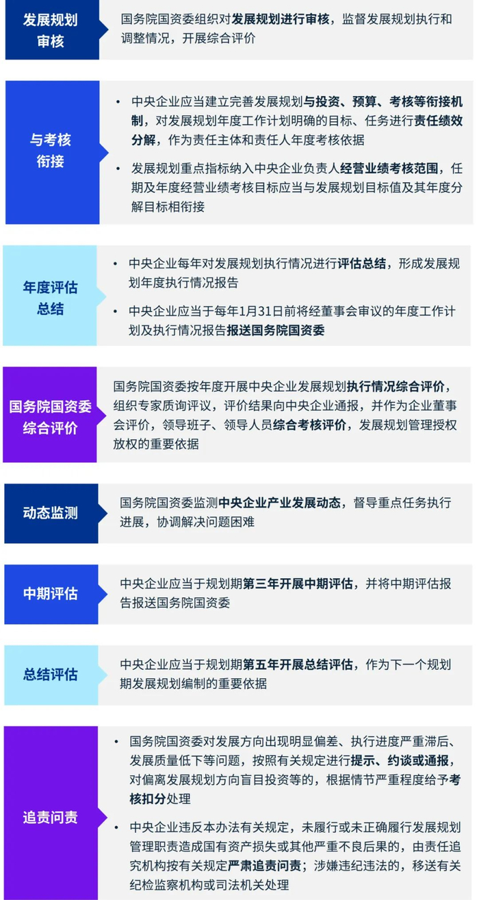 此外,《规划管理办法》对于一些关键的时间节点也进行了规定,包括发展规划预研工作启动时间、规划报送时间、中期评估和总结评估的时间、年度工作计划及执行情况报告报送时间等,这对于央企规划编制工作流程提出了刚性要求,防止央企仓促决策、规划编制工作“形式化”情况的出现,提升了发展规划的规范性、科学性、权威性和严肃性。