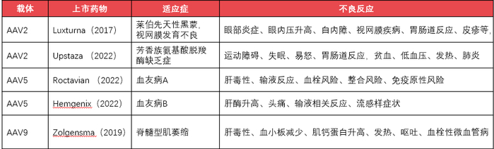 表3 已上市AAV载体基因治疗药物临床不良反应