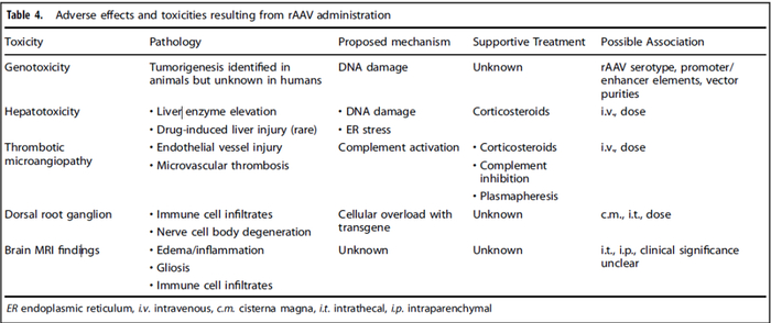尽管AAV载体是目前已知安全性较好的病毒载体,但病毒本身会激活免疫系统,仍不可避免地带来一些不良反应。在过去几年中,与AAV疗法安全性相关的报道频出,FDA也因安全性问题叫停了多项AAV基因疗法的开发。上市AAV类产品和已开展的临床研究中较为常见的一些临床不良反应,汇总于表3和表4。