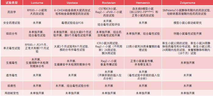 如前所述,全球已有9款AAV基因治疗药物获批上市,汇总具有代表性的国外5个AAV上市药物的非临床研究开展情况(见表5)。