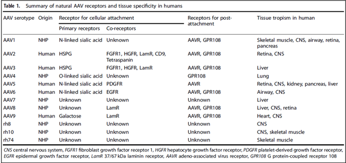 目前已知AAV至少有13种血清型和多种不同的变体,具有不同的组织嗜性(见表1)。人体对AAV的高易感性导致约40%~80%人群存在抗AAV抗体,但目前公认AAV对人类无致病性。