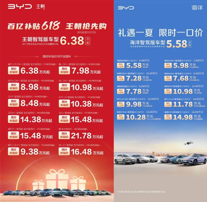 其实,比亚迪取消限时“一口价”并不突然,早在推出时就已经确立了截止日期。5月23日,比亚迪推出限时“一口价”或限时补贴的促销活动。活动涉及王朝网、海洋网共计22款智驾版车型,最高补贴优惠5.3万元,活动时间截止6月30日。