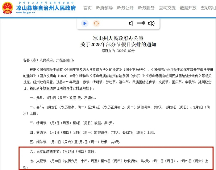 除国家的法定假日外,凉山州还多了“民族团结进步节”“火把节”“州庆”“彝历新年”四个节假日,共计比国家法定假日多休16天。