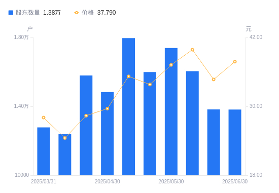 近一年(2024年6月30日至2025年6月30日),金凯生科A股股东户数从1.5万户,减低至1.38万户,降幅8.10%,区间股价上涨4.99%。