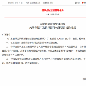 7月1日金融一线消息,国家金融监督管理总局发布关于张恺广发银行副行长任职资格的批复,核准张恺广发银行股份有限公司副行长的任职资格。