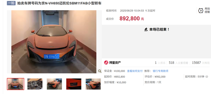 6月29日,阿里资产司法拍卖平台公示信息显示,一辆京牌二手迈凯伦650SSpider豪华跑车以89.28万元的起拍价成交,全程无竞价加价环节。据拍卖公告,该车评估价为99.2万元,出厂于2014年,表显里程仅5600公里,拍卖时车辆处于查封扣押状态。尽管拍卖页面吸引1.4万人次围观,但仅1人报名参与竞拍。