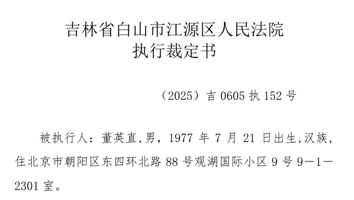 据吉林省白山市江源区人民法院(2025)吉0605执152号执行裁定书信息,被执行人董英直,男,1977年7月21日出生,汉族。董英直因犯职务侵占罪,被依法判处有期徒刑十年六个月,并处没收个人财产人民币450万元,法院裁定对扣押在案的迈凯伦跑车进行司法拍卖。经法院认定,该车购买资金包含违法所得81.8万元,裁定对该部分违法所得对应的车辆份额及其收益进行追缴,并返还被害单位江源农商行。同时,冻结在案的抚顺东洲抚银村镇银行股份有限公司股权及其收益,也被裁定依法追缴,返还被害单位江源农商行。对于董英直违法所得总额41.4亿元,经追缴后仍不足部分,法院责令其继续退赔江源农商行。除上述明确追缴的财产外,对查封、扣押、冻结的其他财物,由相关机关依法处置。