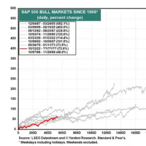 据称,标普500指数目前这轮牛市的回报率可能堪比上世纪60年代中期以来的一些最佳牛市