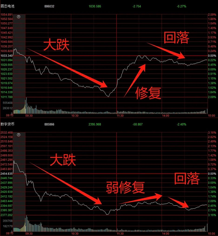 今天日内波动有点大,早上开盘轮动修复,但固态、稳定币大跌;盘中资金忙着抢修复;收盘又回落,一堆亏钱效应。