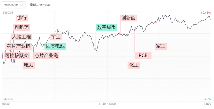 盘面上,创新药概念持续走强,昂利康、塞力医疗等多股涨停;半导体芯片产业链集体爆发,光刻机、光刻胶、chiplet等方向领涨,凯美特气、锴威特等十余股涨停;军工板块探底回升,长城军工、利君股份涨停封板;银行板块震荡反弹,建设银行、浦发银行盘中续创历史新高;电力股震荡走高,华银电力、华电辽能封板;PCB概念午后震荡回升,东山精密涨停创历史新高。此外,核聚变、教育、化工等方向均有所表现。