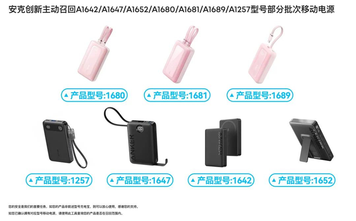 这里也附上Anker的召回名单,型号分别为:A1642(143327件)/A1647(134854件)/A1652(109450件)/A1680(24480件)/A1681(223558件)/A1689(45438件)/A1257(31857件),请持有相关批次产品的用户立即停止使用。正在用Anker的用户一定要记得查看下自己的充电宝是否在名单中。