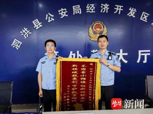 扬子晚报网7月1日讯(通讯员 崔立 李小珍 记者 高峰)6月28日,泗洪县公安局经济开发区派出所民警张波、刘山收到一份跨越千里的特殊谢意——一面来自武汉市民陈先生的锦旗,锦旗上印着“不因案小推诿 明断网络是非 新领域敢亮剑 守护数字时代”的赞语,表达了对民警高效破案、为其挽回损失的行为由衷感谢。