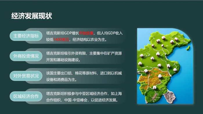 再来看经济基本面。塔吉克斯坦去年的GDP增长率高达8.4%,虽然114亿美元的经济总量基数还比较小,但也正因为基数小,才意味着广阔的上升空间。他们正处在一个高速发展的上升期,许多领域的技术人才、资金储备乃至商业模式,都远未达到我们国内的成熟度。这为中国企业家提供了一个绝佳的机会,我们可以带着国内已经验证成功的成型产品、商业模式和技术人才,去那里进行“降维”复制和落地,分享其高速增长的红利。