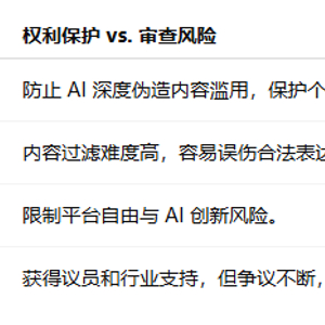 ·压制创新者:法案不仅适用于内容发布者,还可能波及开发AI工具的机构,因其制作相关模型与软件的能力受到限制,引发对 AI 创新生态的担忧。
