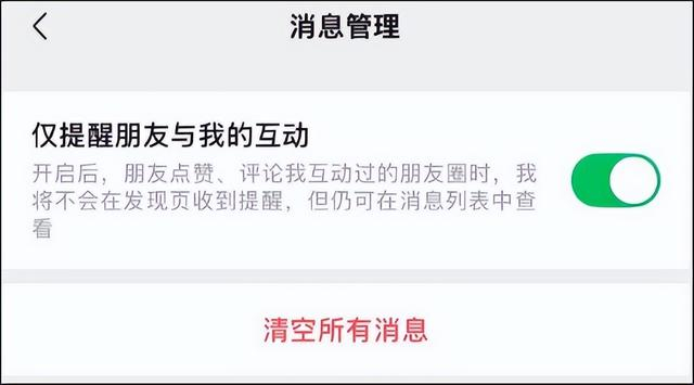 开启路径:将微信更新至最新版本后,进入【我】—【朋友圈】—【我的朋友圈】— 右上角【…】— 【消息列表】— 再次点击右上角【…】进入【消息管理】,此时多了一个“仅提醒朋友与我的互动”设置页面。