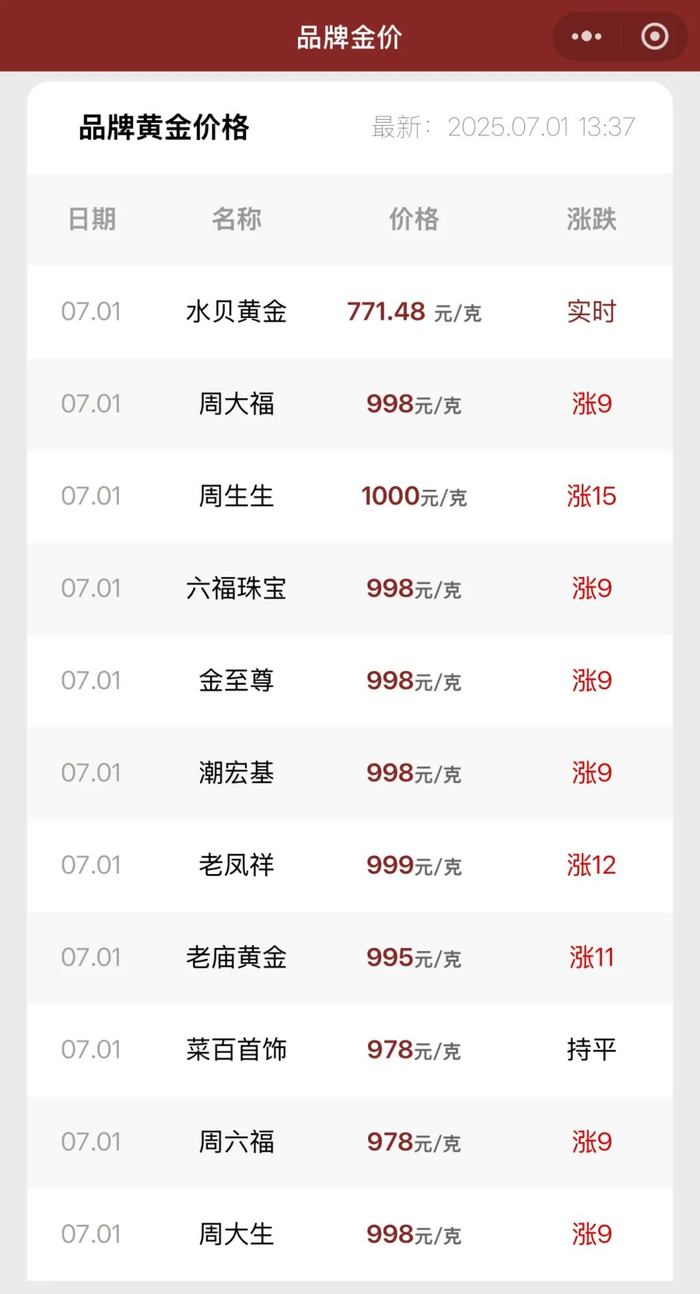 受此影响,国内黄金品牌价格随之攀升,克价纷纷涨至千元左右。
