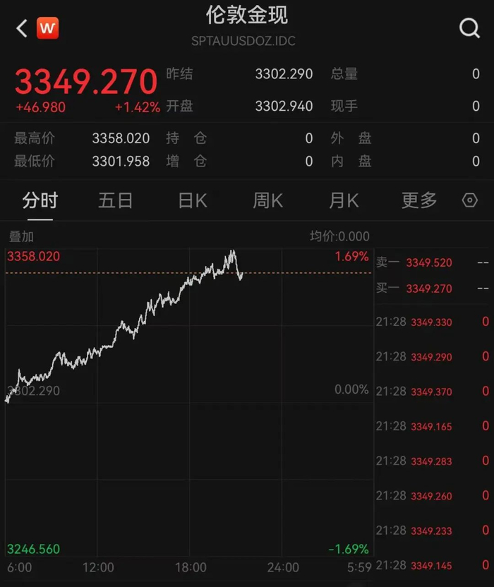7月1日,国际金价出现转涨行情。据wind数据,截至发稿,现货黄金涨1.43%,报3349.38美元/盎司。