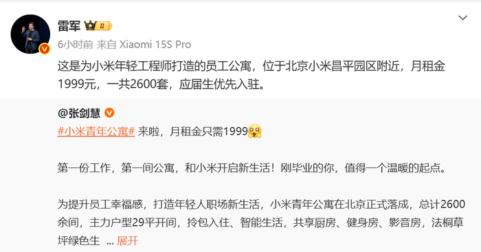 7月1日下午,雷军本人转发小米青年公寓相关信息,并表示:这是为小米年轻工程师打造的员工公寓,位于北京小米昌平园区附近,月租金1999元,一共2600套,应届生优先入驻。