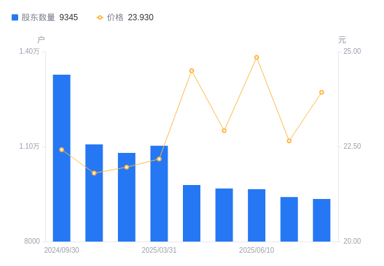 近一年(2024年6月30日至2025年6月30日),兴欣新材A股股东户数从1.54万户,减低至9345户,降幅39.36%,区间股价上涨19.17%。