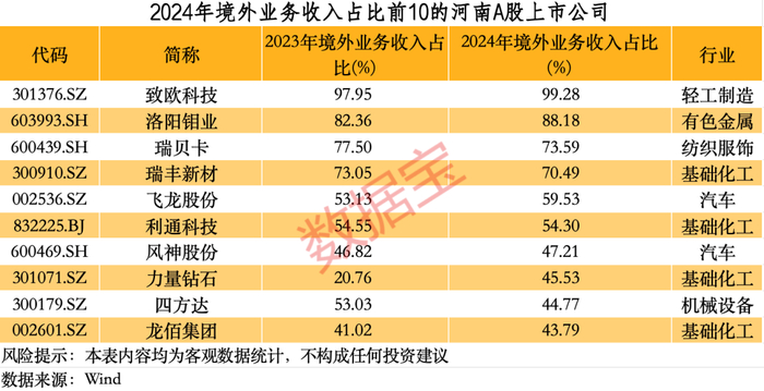 从单家公司来看,境外业务收入占比居前的以有色金属、轻工制造、基础化工、汽车行业为主。致欧科技、洛阳钼业、瑞贝卡、瑞丰新材、飞龙股份、利通科技2024年境外业务收入占比均超过50%。