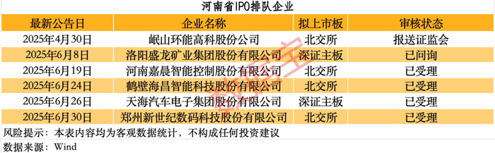 目前IPO排队企业中(剔除状态为终止、中止审查的公司),有6家公司IPO顺利推进。4家拟登陆北交所,分别为鹤壁海昌智能科技股份有限公司、河南嘉晨智能控制股份有限公司、岷山环能高科股份公司、郑州新世纪数码科技股份有限公司。2家拟登陆深证主板,分别为洛阳盛龙矿业集团股份有限公司、天海汽车电子集团股份有限公司,前者属于地方国有企业。