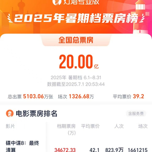 据灯塔专业版,截至7月1日20时53分,2025年暑期档(6月-8月)总票房(含预售)突破20亿!《碟中谍8:最终清算》《酱园弄·悬案》《新·驯龙高手》《名侦探柯南:独眼的残像》《时间之子》暂列票房前五名,并且档期票房均已破亿。