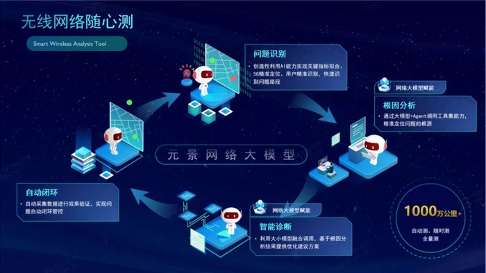 道路测试优化是无线网络优化过程中的一个重要工作环节,传统的路测作业需要投入大量的人力物力。无线网络随心测依托数据中心新底座O域数据,关联多维4/5GMDT/XDR/PM/CM数据,通过网络大模型实现“自然语言指令+图形化操作”双模式联动,并利用Agent路测工作流工具的协同能力,自动完成根因分析、生成优化解决方案并提供效果评估,最终实现自动化闭环。通过网络关键指标拟合、用户精准定位、用户行为识别模型等多个核心AI能力,生成道路网络关键指标,并利用海量全国数据,提供道路7×24小时随时测、全量测、自动测服务,极大提升了一线网优工程师网络测试的智能化水平和效率,已成为全国一线网优人员自动路测的必备工具。
