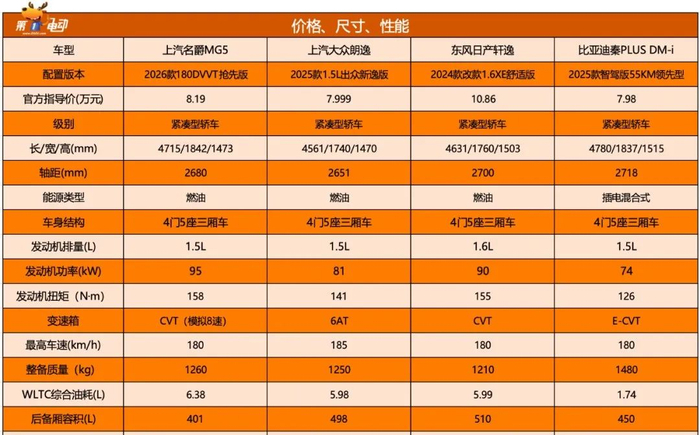 从价位和定位来看,2026款MG5的主要竞品,包括上汽大众朗逸、东风日产轩逸以及比亚迪秦PLUS DM-i等车型。