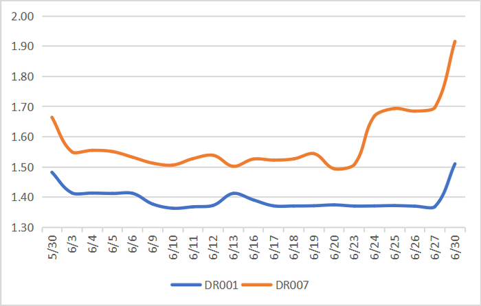 据外汇交易中心数据显示,6月隔夜(DR001)质押式回购利率区间在1.36%-1.51%,7天(DR007)质押式回购利率区间在1.49%-1.92%。