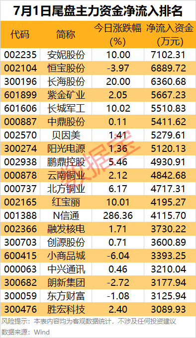安妮股份尾盘冲上涨停,股价创今年以来的新高,尾盘获主力资金净流入7102.31万元,居首。