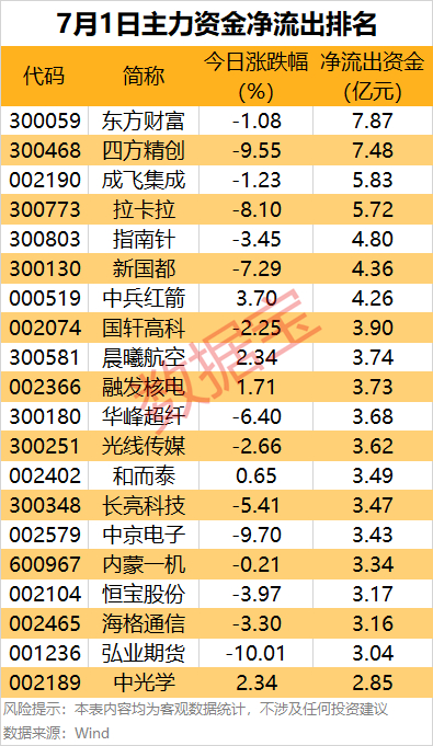 据数据宝统计,超90股遭主力资金净流出均超1亿元,其中19股遭主力资金净流出均超3亿元。互联网券商龙头股东方财富遭主力资金净流出为7.87亿元,居首。