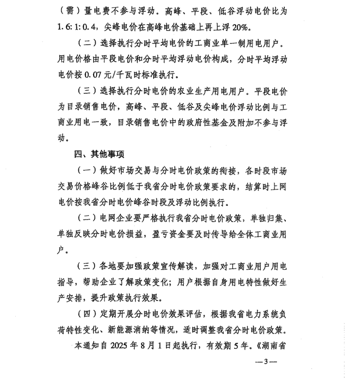 近日,湖南省发改委下发《关于优化我省分时电价政策有关事项的通知》(原文见附件),提出:对湖南省分时电价政策进行了优化调整,最新方案如下表所示。该方案自2025年8月1日起执行,有效期5年。