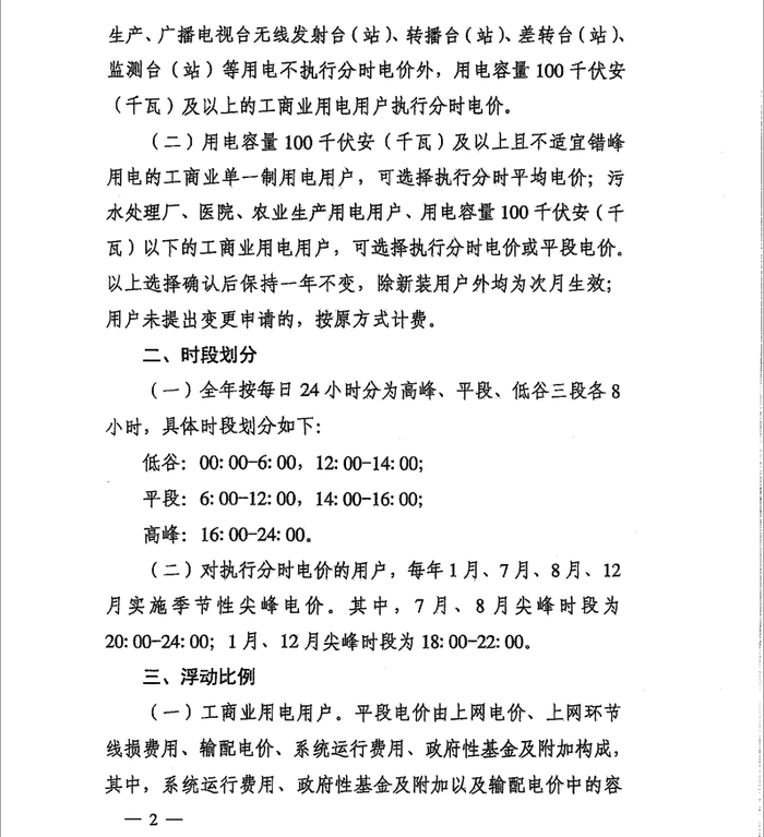 1)除电气化铁路牵引、监狱生产企业及城乡供水企业 生产、广播电视合无线发射台(站)、转播台(站)、差转台(站)、 监测台(站)等用电不执行分时电价外,用电容量100千伏安 (千瓦)及以上的工商业用电用户执行分时电价。
