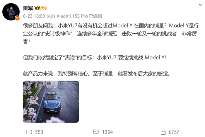 6月26日,小米汽车旗下首款SUV小米YU7上市,新车共推出标准版、Pro版、Max版3种车型,售价分别为25.35万元、27.99万元、32.99万元,动力上提供包括单电机后驱、双电机四驱、双电机高性能四驱版本共计3种版本。小米YU7上市后最强劲的对手便是Model Y。关于小米YU7是否会超过Model Y在国内的销量,雷军此前也曾解释:“Model Y是行业公认的‘史诗级神作’,连续多年全球销冠,击败一轮又一轮的挑战者,非常厉害!但我们依然制定了“离谱”的目标:小米YU7要继续挑战Model Y!就产品力来说,我特别有信心。”据小米汽车官微显示,小米YU7一上市大定订单就迅速飙升,小米YU7上市3分钟大定突破20万,上市1小时大定突破28.9万,开售18小时锁单量突破24万。小米YU7一上市就成为爆款车型,也意味着后续Model Y将面临更激烈的市场竞争。