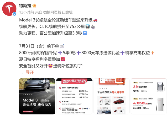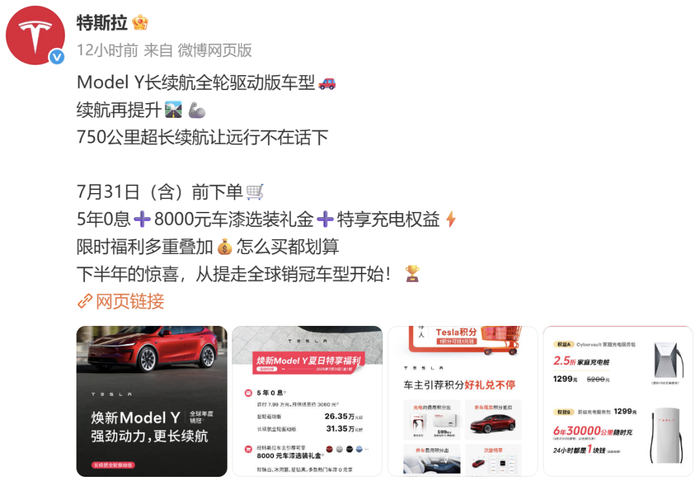 除此之外,特斯拉中国还宣布,7月31日前下单Model 3车型能叠加8000元限时保险补贴、5年0息、8000元车漆选装礼金、特享充电权益等多重福利;7月31日前下单Model Y能叠加5年0息、8000元车漆选装礼金、特享充电权益等多重福利。