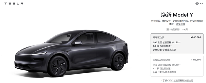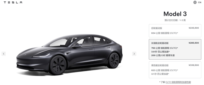 官网显示,目前Model 3后轮驱动版和长续航全轮驱动版交付日期均为1至3周,高性能全轮驱动版交付日期为8-10周;Model Y长续航全轮驱动版和后轮驱动版交付日期为1至3周。